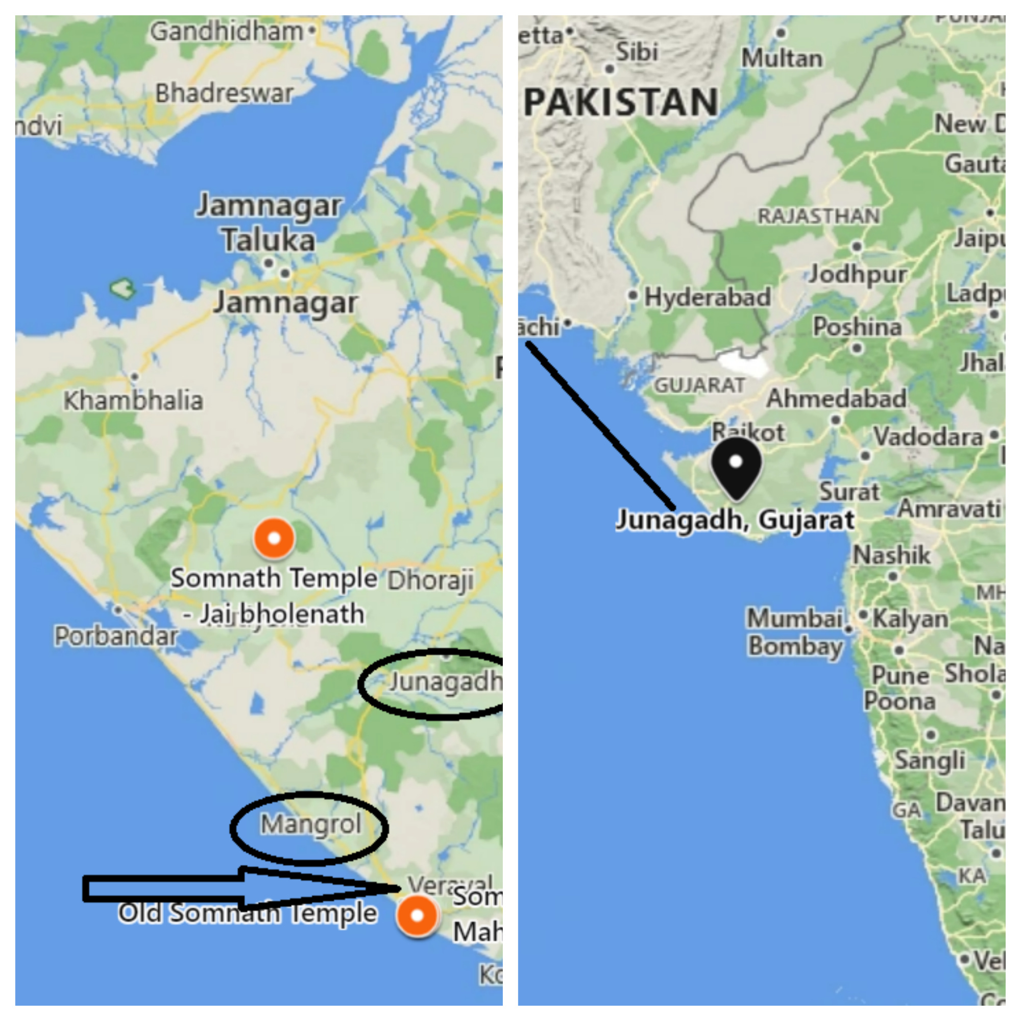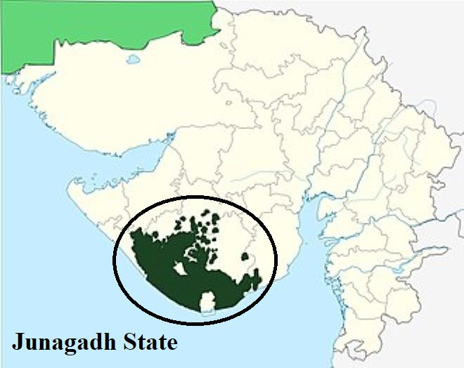 The princely state of Junagadh is at the south-western corner of the Saurashtra peninsula of modern Gujarat. It was an important state of what was known as the Kathiawar group of states in pre-independence India. Junagadh was deep inside and surrounded on three sides by India and on the south and southwest by the Arabian Sea. It has no overland route to Pakistan. The distance between the nearest ports Veraval (Junagadh) and Karachi (Sind, Pakistan) is about 300 miles.